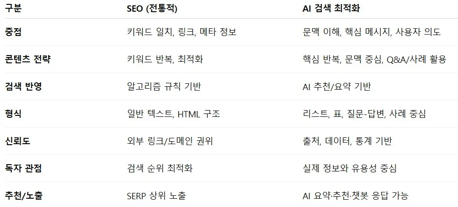 기존 SEO가 단순히 키워드와 링크 중심으로 검색 엔진 순위를 올리는 데 초점을 맞췄다면, AI 최적화는 글 전체의 문맥, 핵심 메시지, 독자가 얻는 정보까지 고려합니다.