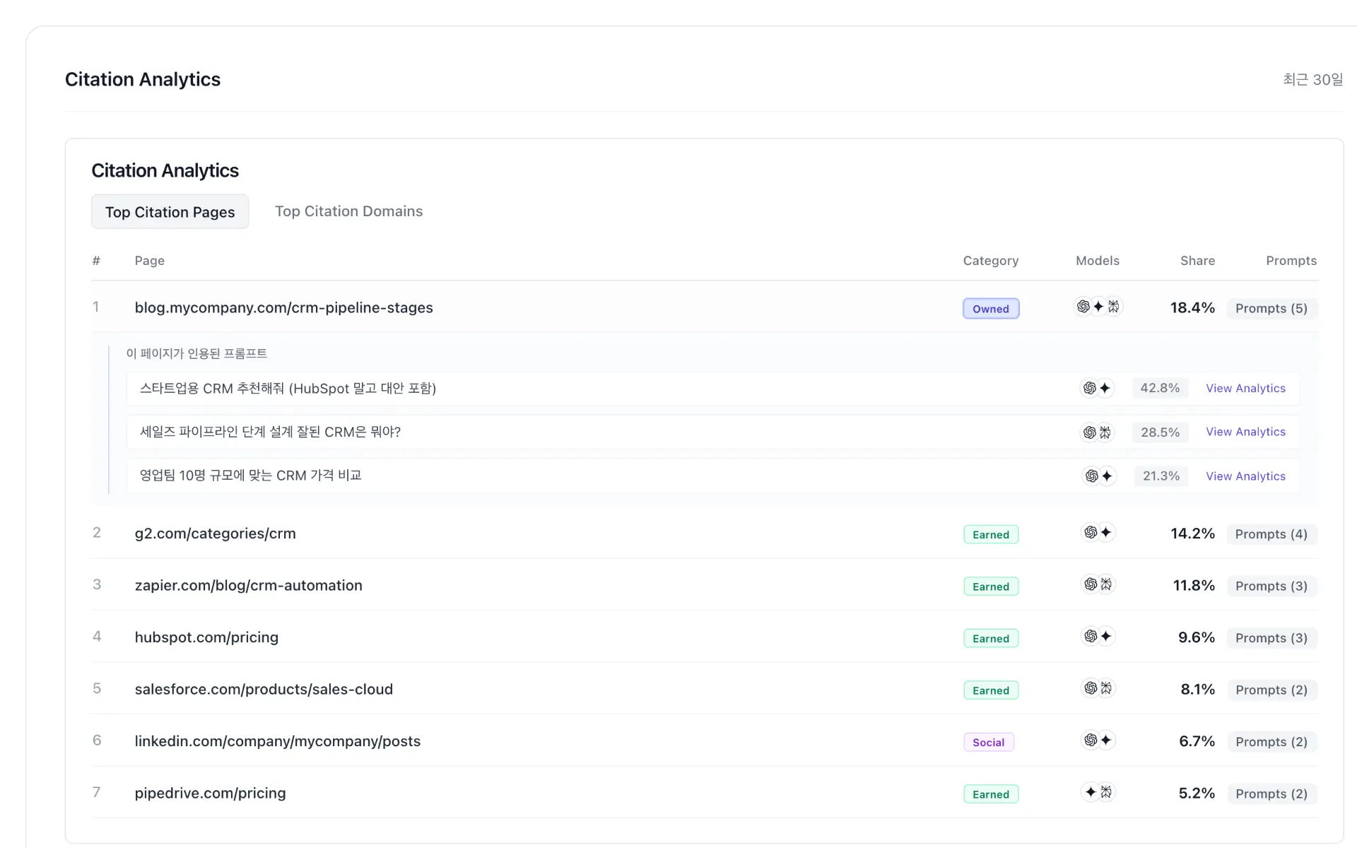 AI 검색 환경에서는 ‘잘 만든 콘텐츠’보다 ‘AI가 실제로 인용하고 있는 콘텐츠’가 무엇인지가 더 중요해졌습니다. 그래서 실무자는 우리 브랜드가 AI 검색에서 어떤 질문에, 얼마나 자주, 어떤 맥락으로 인용되고 있는지를 데이터로 확인하며 전략을 세워야 합니다.