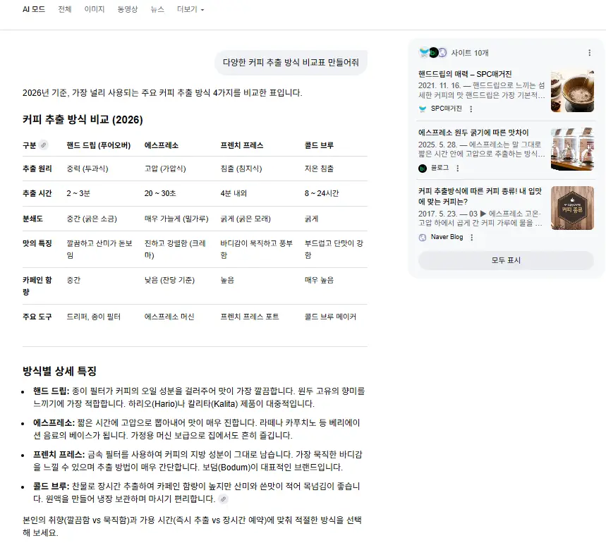 AI 모드는 기존 검색과 다른 모델 및 기법을 사용할 수 있으며, 그 결과 노출되는 링크와 콘텐츠 집합이 기존 검색 결과와 달라질 수 있습니다.