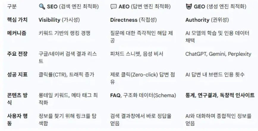 이처럼 AI 검색이 보편화되면서 SEO에 이어 AEO, GEO라는 개념이 등장했습니다.