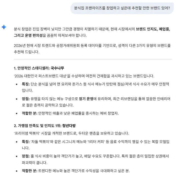 분식집 프랜차이즈 창업 질문에 대한 Gemini의 답변