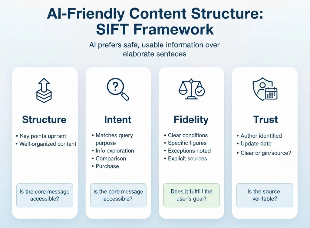AI는 화려한 문장보다 안전하게 쓸 수 있는 정보를 선호합니다. 그래서 콘텐츠를 이용할 때 ‘SIFT 프레임워크’라는 기준을 활용합니다.