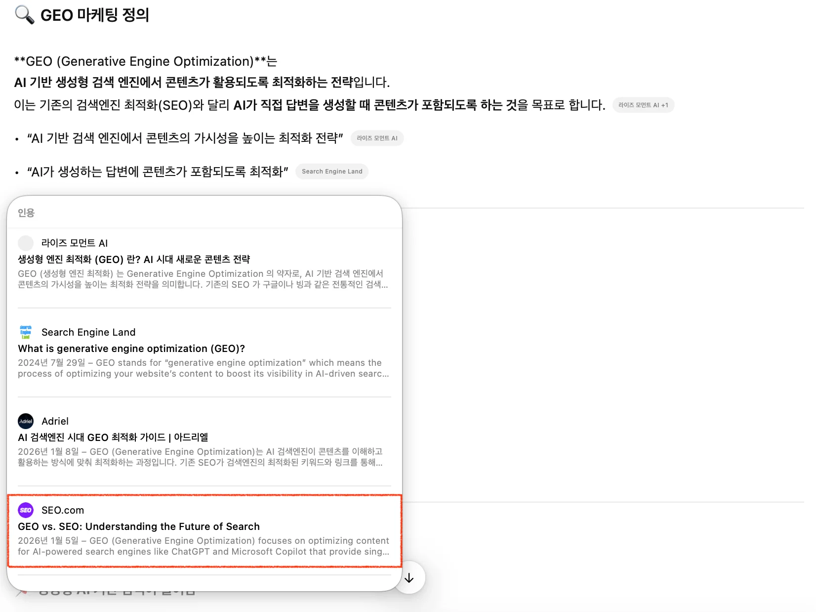 챗GPT에 ‘GEO 마케팅’에 대해 물어봤을 때 자주 뜨는 SEO.COM의 콘텐츠를 바탕으로 작성 원칙을 설명해 보겠습니다.