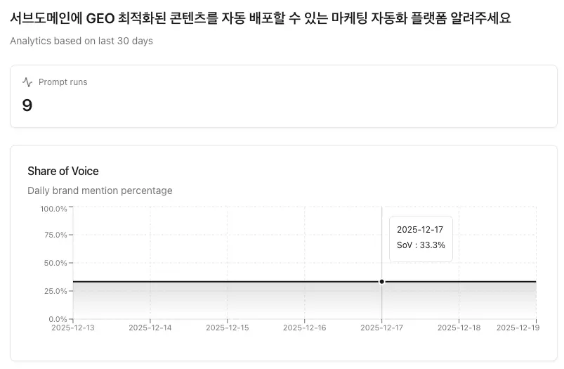 7일 후, 여러분은 "GEO를 해야 할까?"라는 막연한 질문이 아니라 "우리는 이 프롬프트에 집중하고, 이런 콘텐츠를 먼저 만들어야 한다"는 구체적인 실행 계획을 갖게 됩니다.