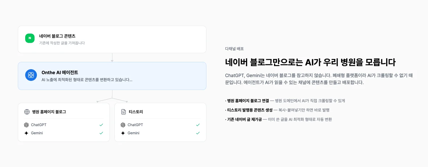 원장님이 네이버에 이미 쌓아두신 시술 설명, 사례 소개, 자주 묻는 질문에 대한 답변 콘텐츠들이 훌륭한 자산입니다. 문제는 이걸 AI가 읽을 수 있는 형태로 바꾸고, 적절한 채널에 발행하는 과정이 번거롭다는 거죠.