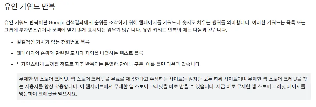 과거 SEO에서는 인위적인 키워드 반복 삽입이 검색엔진에 주제를 각인시키는 방법 중 하나로 여겨진 적이 있습니다. 하지만 생성형 AI는 키워드 출현 빈도가 아닌 정보의 의미와 가치를 기준으로 콘텐츠를 평가합니다. 따라서 과도하게 키워드를 넣으면 오히려 문맥의 자연스러움을 해치고 정보 밀도를 낮춰 답변에 활용하기 적합하지 않다고 판단할 수 있습니다.