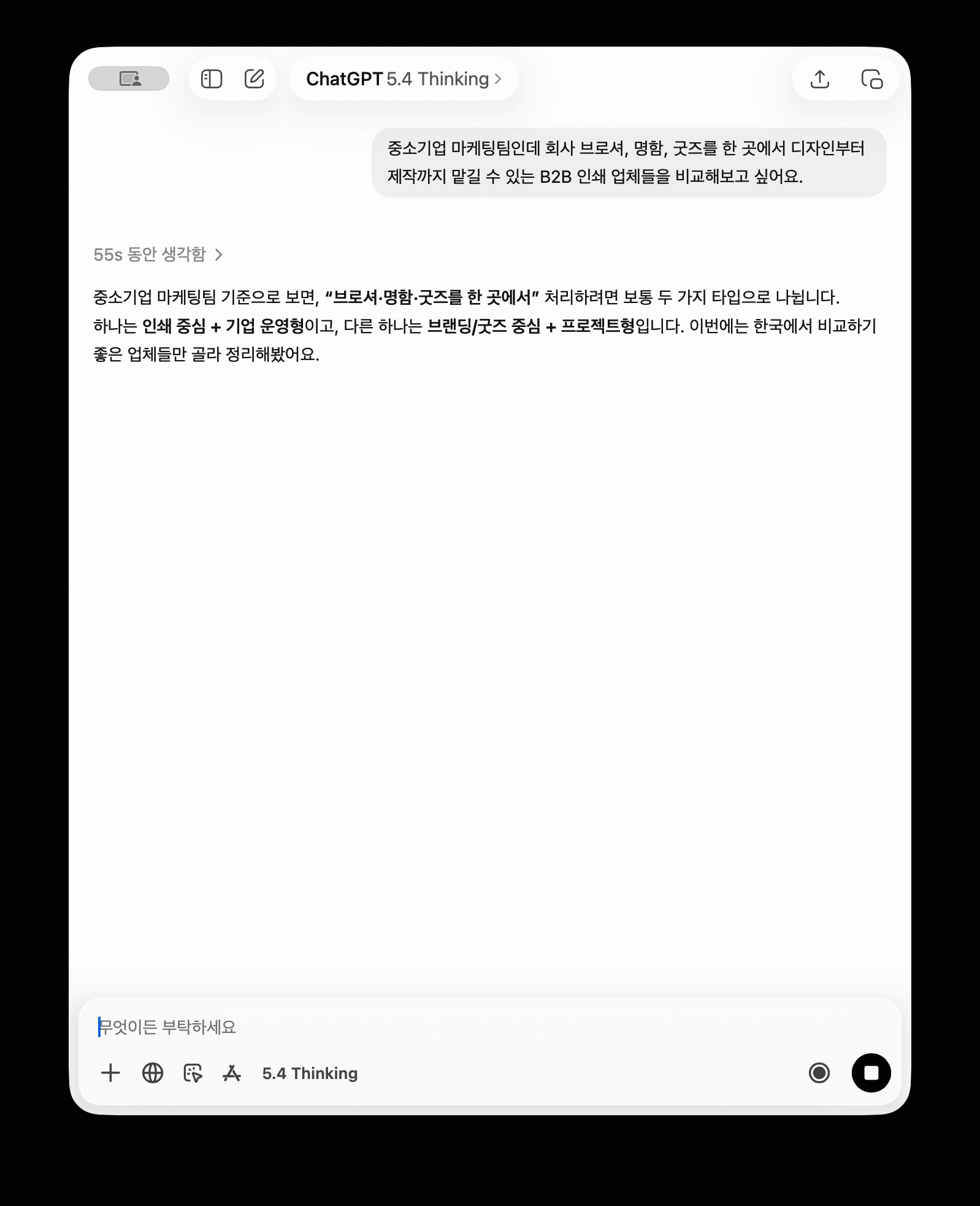 B2B 인쇄 서비스를 AI에게 물어보면, 킨코스가 가장 먼저 나옵니다.