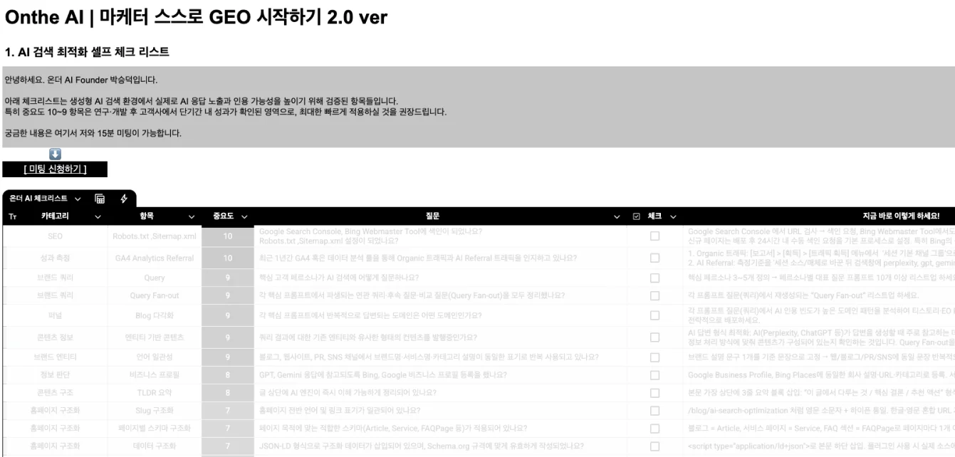 이번 글에서는 온더 AI가 정리한 2026 GEO 체크리스트를 기반으로 GA4와 온더 AI 데이터를 활용해 지금 당장 실행할 수 있는 구체적인 전략을 소개합니다.