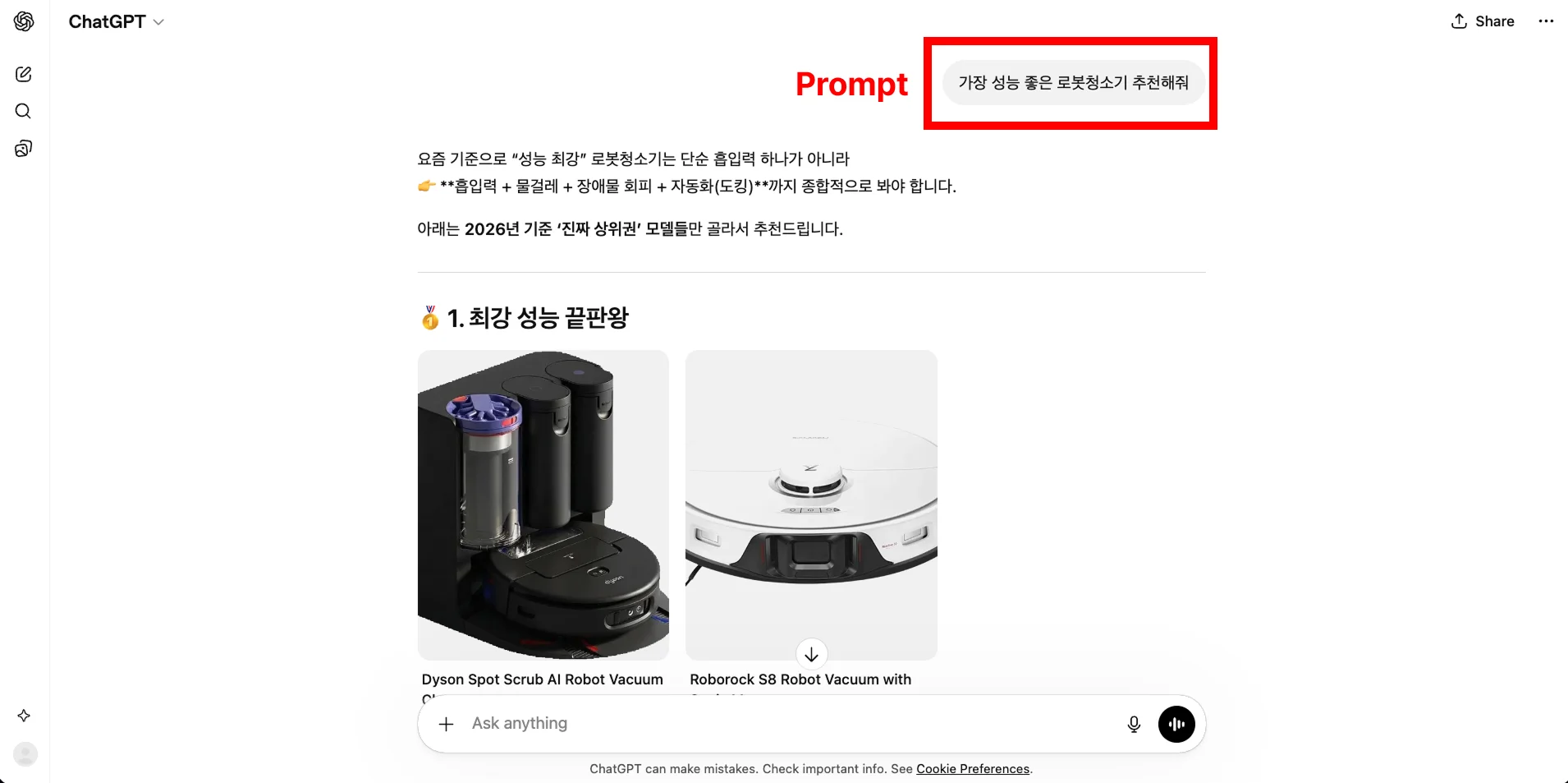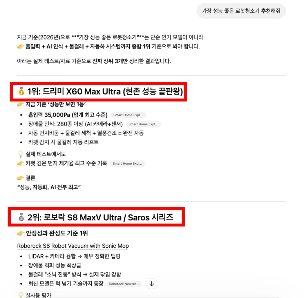 ChatGPT 화면 상단의 입력창은 고객의 '의도'가 담기는 곳입니다. 고객이 "가장 성능 좋은 로봇청소기 추천해줘"라고 물었을 때, AI가 우리 브랜드를 언급하는지 아니면 누락하는지를 분석해야 합니다.