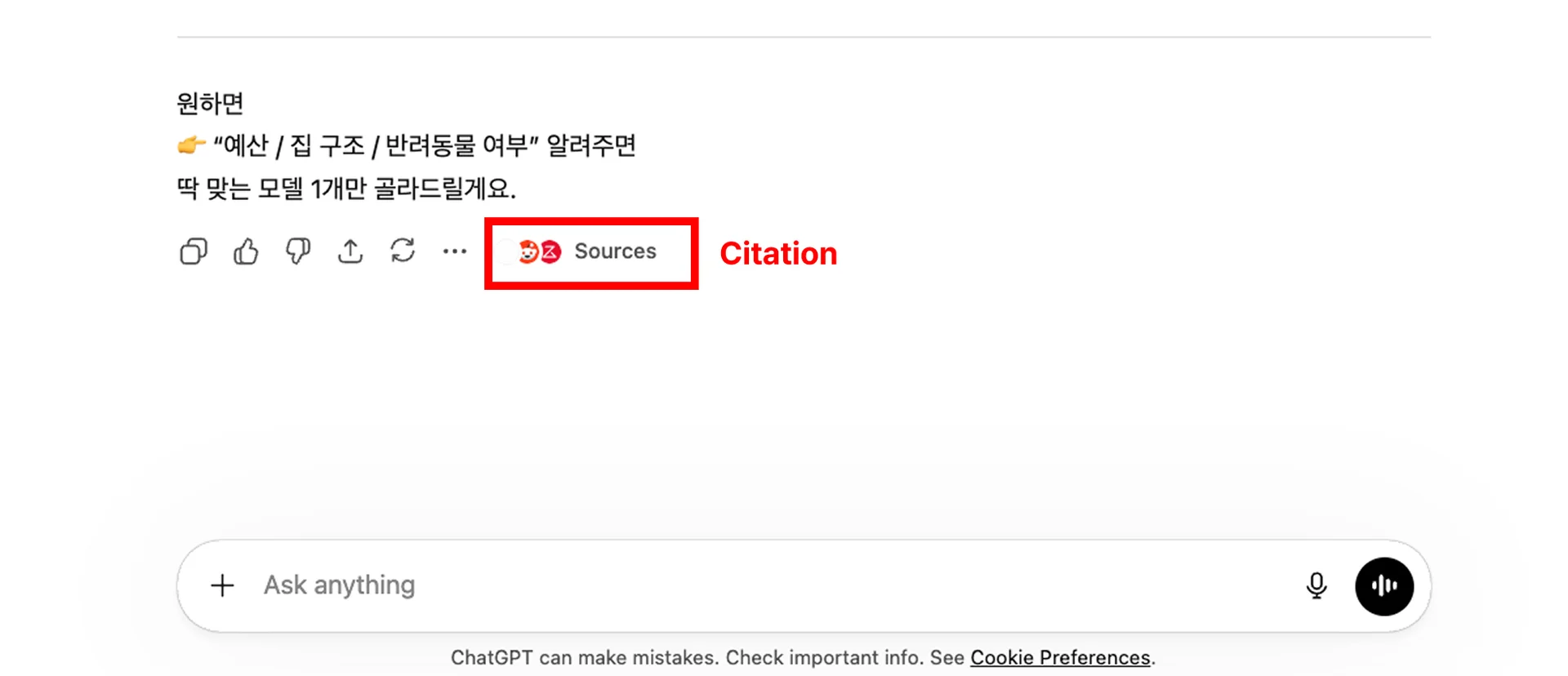 AI는 환각(Hallucination)을 줄이기 위해 신뢰할 수 있는 웹상의 정보를 '인용'합니다. 답변 하단이나 본문 중간에 표시되는 '출처'가 바로 그것입니다.