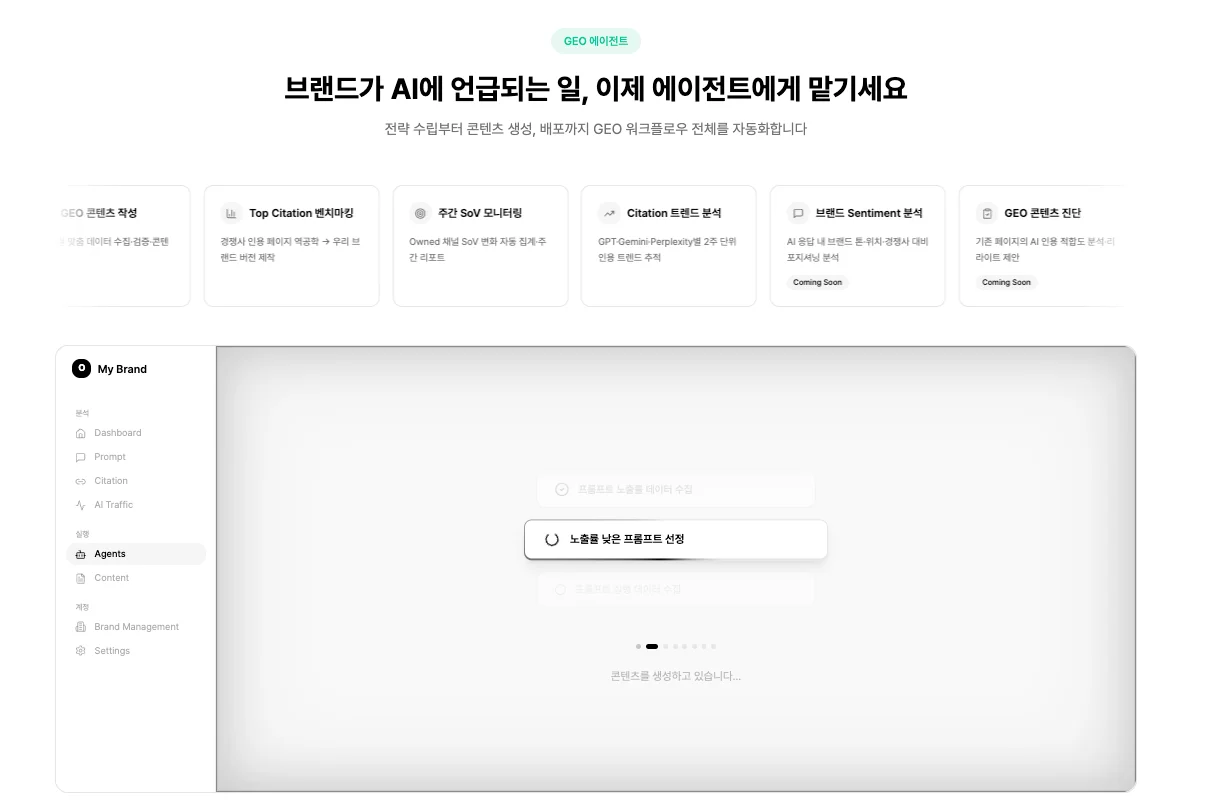 콘텐츠 생성 및 배포: AI가 좋아하는 구조의 콘텐츠를 자동 생성하고, 인용될 수 있는 채널에 전략적으로 배포