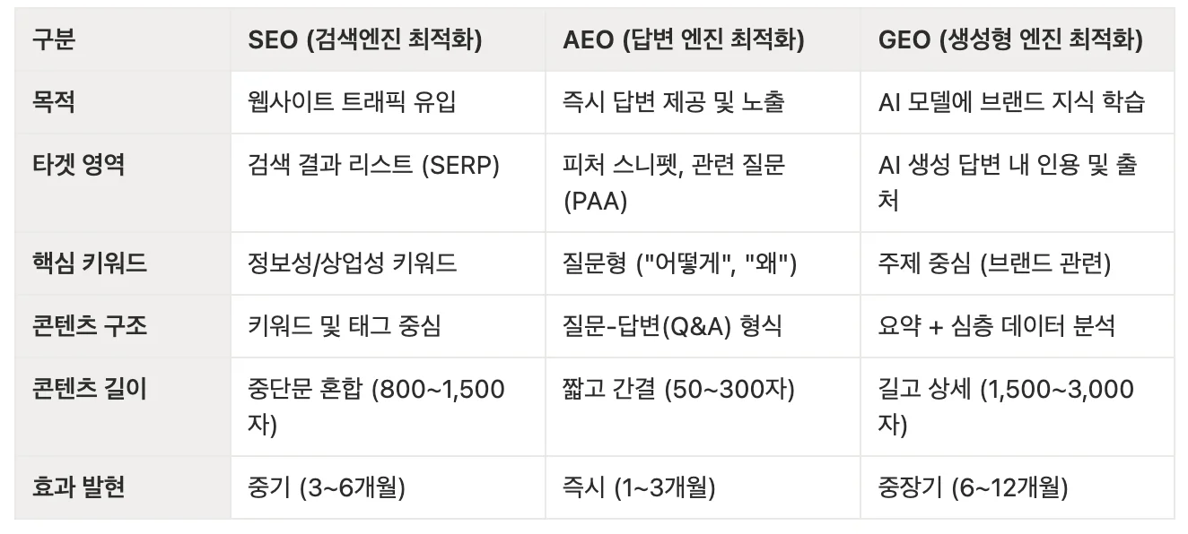 기술적 토대(SEO) 위에 즉각적인 해답(AEO)을 얹고 심층적인 통찰(GEO)로 마무리하는 통합형 구조를 갖추는 게 가장 영리한 전략입니다. 이렇게 하면 검색엔진은 우리를 발견하고, AI는 우리를 답변 소스로 쓰며 우리를 전문가라고 인식하게 됩니다.