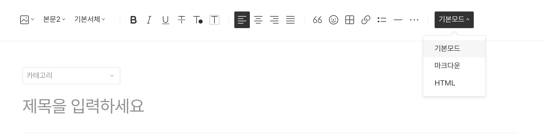 글쓰기 화면이 열리면 상단에 에디터 툴바가 보이고, 우측 상단에 "기본모드" 버튼이 있습니다.