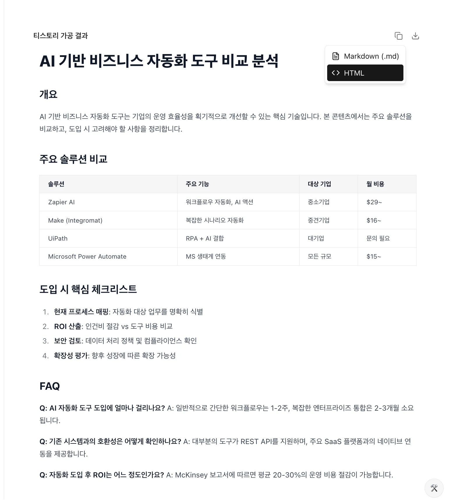 티스토리 2차 콘텐츠 생성 에이전트를 실행하면, 우측에 가공된 결과물이 표시됩니다.