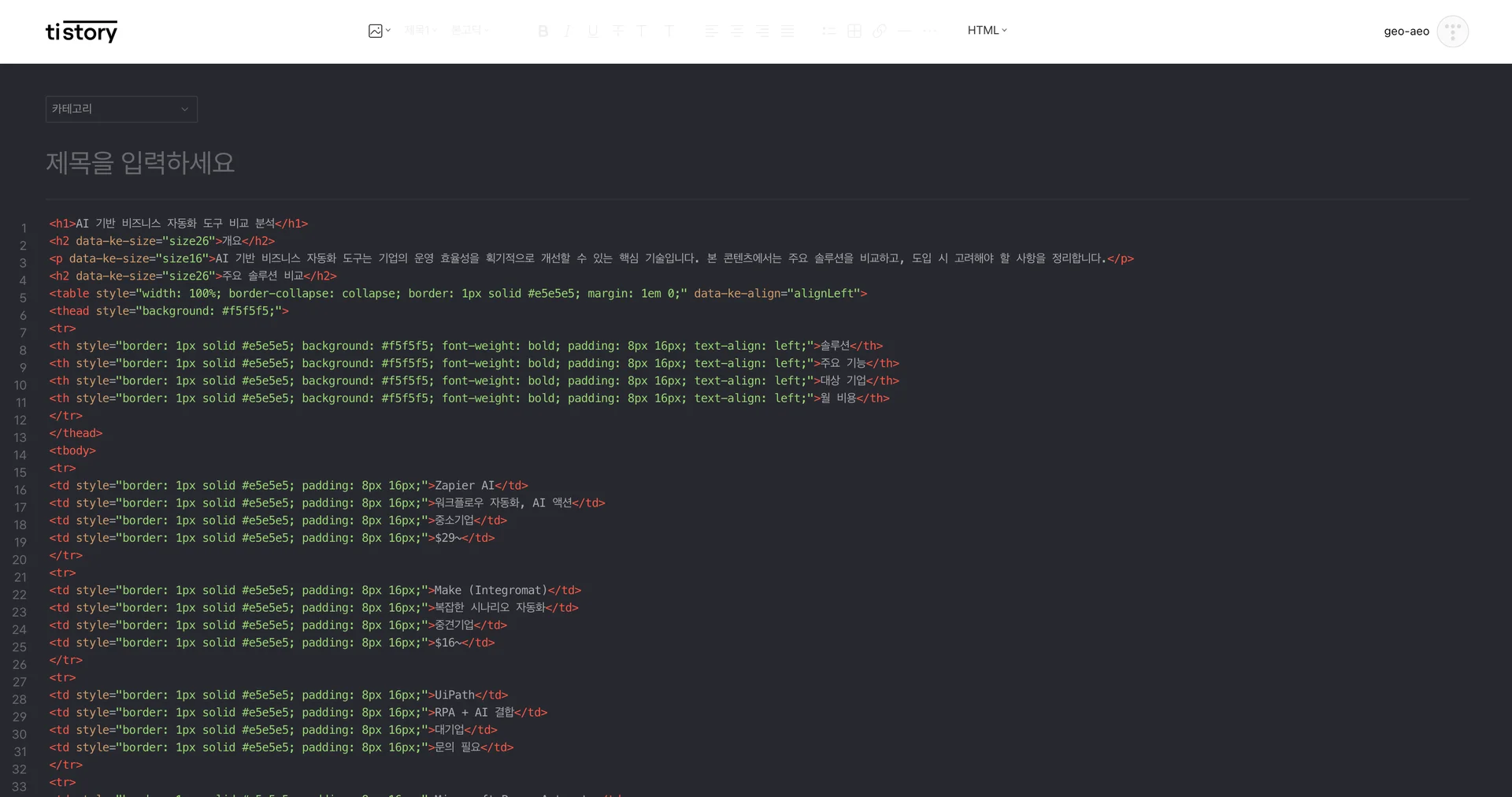 붙여넣으면 빨간색/초록색 등으로 색상이 구분된 HTML 코드가 보입니다. 정상입니다!