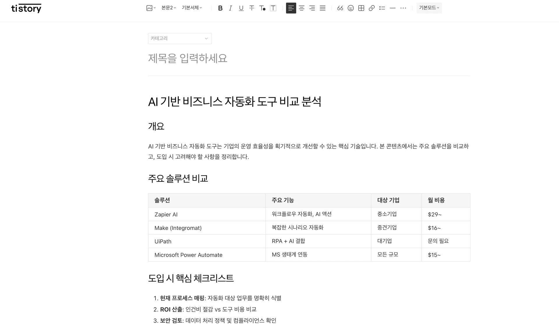이제 제목을 입력하고, 카테고리를 선택한 뒤 수정 및 검수 후 발행하면 끝입니다.
